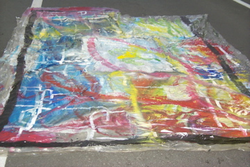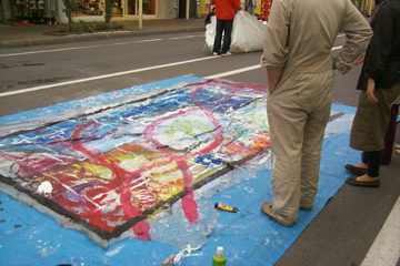 そんななか不思議そうに見ていくおばちゃん、おじちゃん。「なんだろ〜」って感じの子供達。そんな製作中の一コマ。勝負服の僕。途中、手伝ってくれる人も出て来て助かりました、なんたって参加型なんで自分だけでやってはいけないのです。